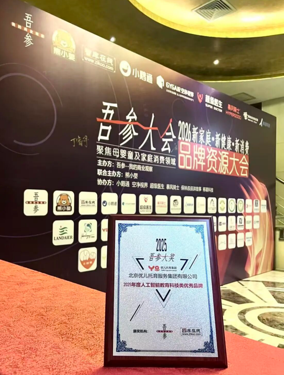 2026年1月16日,在聚焦母婴童及家庭消费领域的“新家庭·新健康·新消费”品牌大会上,优儿集团凭借在人工智能与托育服务深度融合方面的创新成果,成功获评“2025年度人工智能教育科技类优秀品牌”,这一荣誉不仅是优儿在AI研发与AI应用对行业贡献的高度肯定,也彰显出在 AI 技术蓬勃发展浪潮下,优儿集团已成为早期教育领域中,AI应用成效最佳的标杆企业之一。